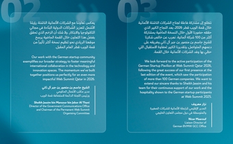 Nizar Maarouf hob den Erfolg der Premiere des Pavillons im Jahr 2025 hervor, bei der über 100 Unternehmen vertreten waren. Er dankte Sheikh Jassim und seinem Team für ihre kontinuierliche Unterstützung und herzliche Gastfreundschaft und betonte, dass dieses Engagement deutschen Start-ups erneut zum Erfolg auf der globalen Plattform im kommenden Jahr verhelfen werde.