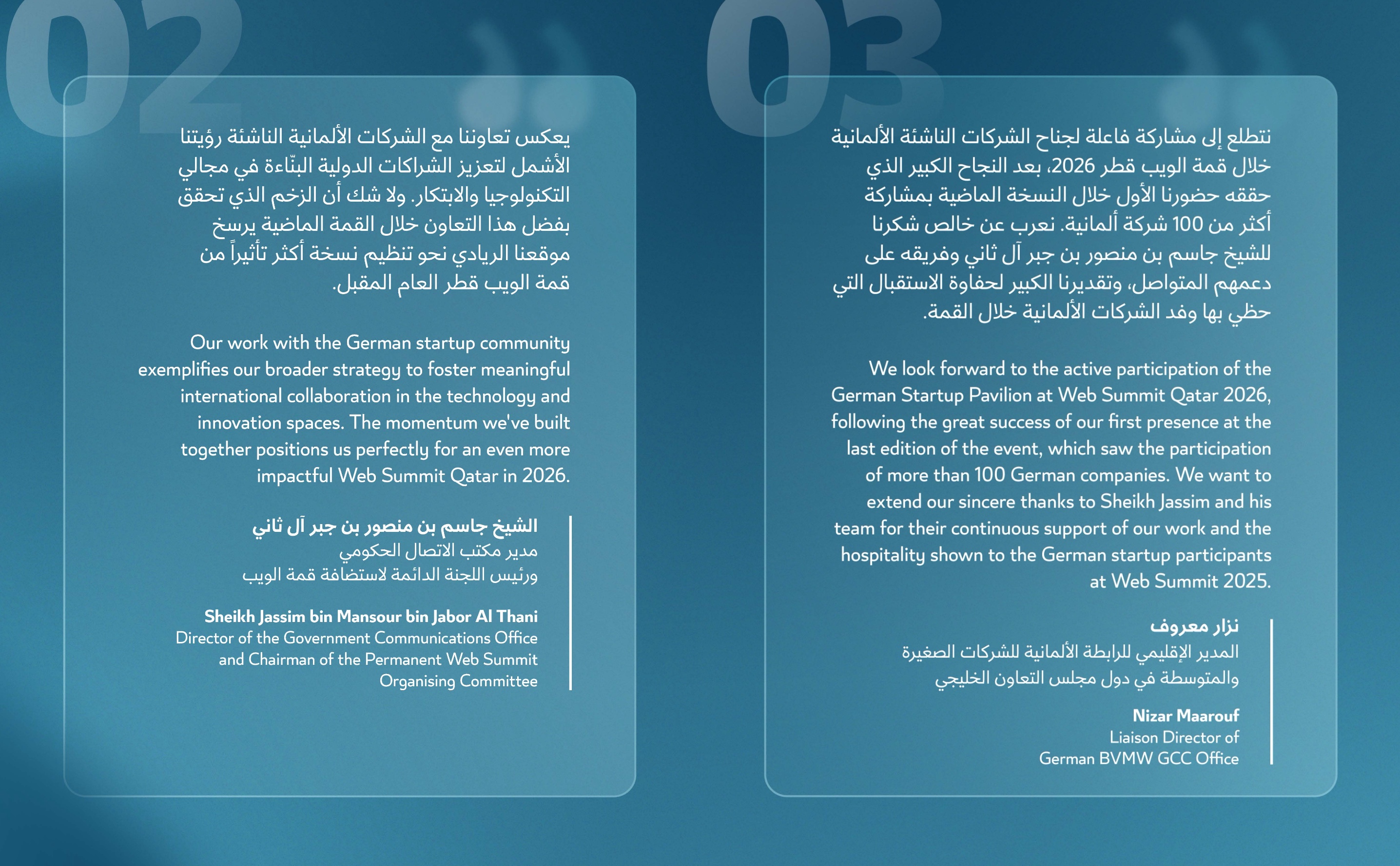 Nizar Maarouf highlighted the success of the pavilion’s debut in 2025, which brought over 100 companies to the event. He expressed gratitude to Sheikh Jassim and his team for their continued support and warm hospitality, noting that this commitment will help German startups thrive again at next year’s global platform.